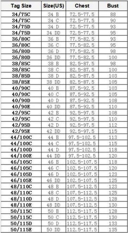 Velikost pasu, velikost skodelice: 34A, 34B, 34C, 34D, 34E, 36A, 36B, 36C, 36D, 36E, 38B, 38C, 38D, 38E, 40C, 40D, 40E , 42C , 42D , 42E , 44C , 44D , 44E , 46D , 46E